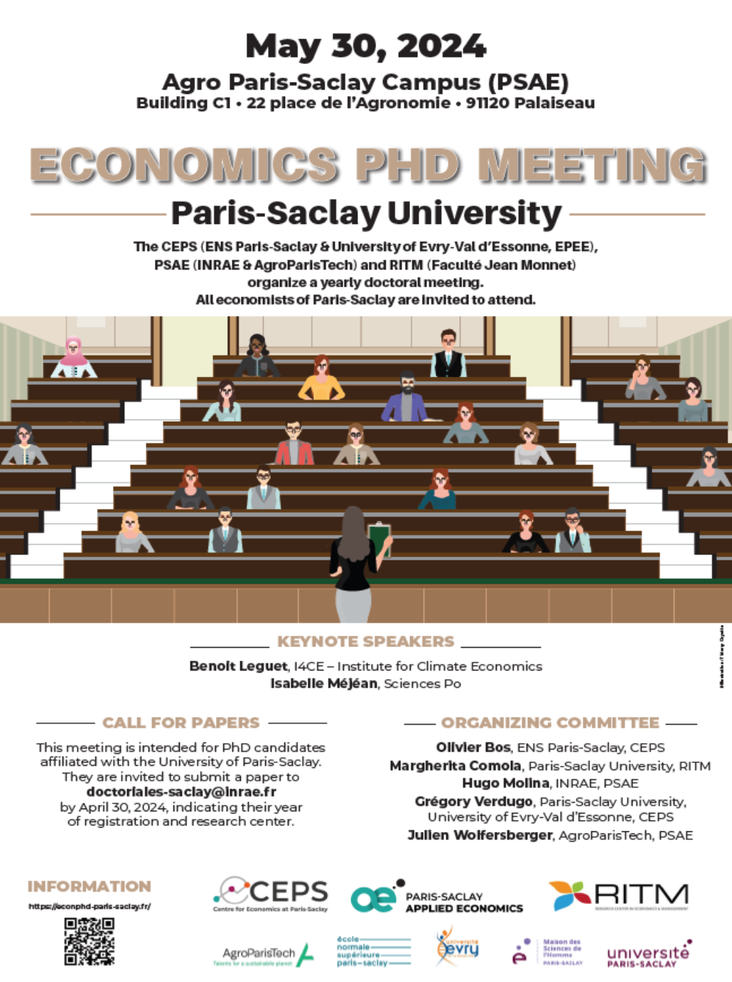 The Université Paris-Saclay and the research units CEPS (ENS Paris-Saclay & University of Evry-Val d’Essonne, EPEE), PSAE (INRAE & AgroParisTech) and RITM (Faculty Jean Monnet) will organize their yearly doctoral meeting on May 30, 2024. This meeting is intended for PhD candidates in economics at Paris-Saclay University, who are invited to submit by e-mail before April 30, 2024, indicating their year of PhD enrollment and affiliation.